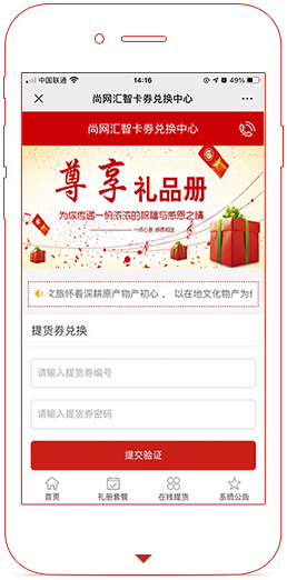 尚網匯智提貨系統適用于節(jié)日禮品兌換、大閘蟹提貨、海鮮提貨、水果提貨、茶葉提貨、大米提貨、農產品提貨、月餅等提貨用途,以及禮券提貨、禮品卡、提貨卡等全平臺覆蓋的專業卡券解決方案。